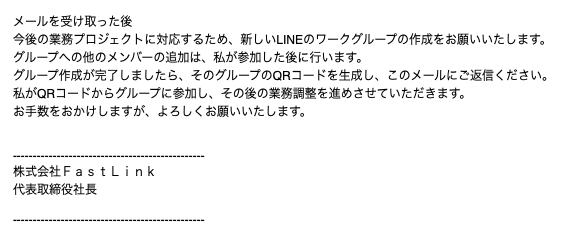 株式会社FAST LINKを名乗り、LINEグループ作成に誘導するような不審なメールを確認しておりますが、弊社ではLINEは使っておりません。